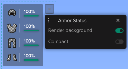 The ArmorStatus module displays an element on your HUD showing you the armor you're currently wearing, as well as the durability of each piece of armor.